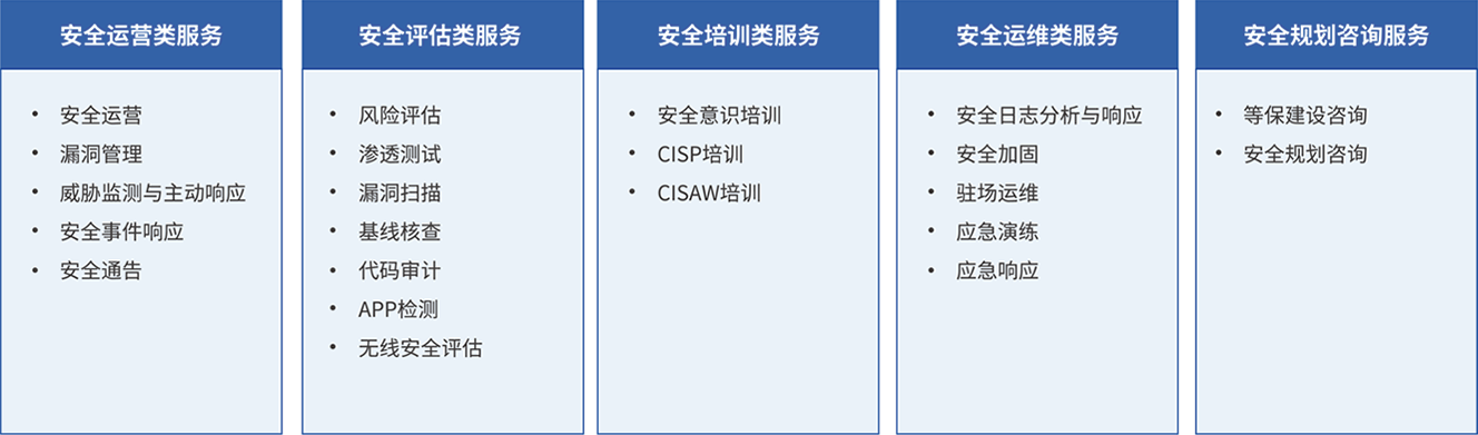海龍科技安全服務(wù)目錄主要分為安全運營、安全評估、安全培訓(xùn)、安全運維、安全規(guī)劃咨詢5大類,為安全建設(shè)不同階段的組織提供從評估到規(guī)劃,再到持續(xù)安全運營的服務(wù),以靈活匹配組織的安全服務(wù)需求。